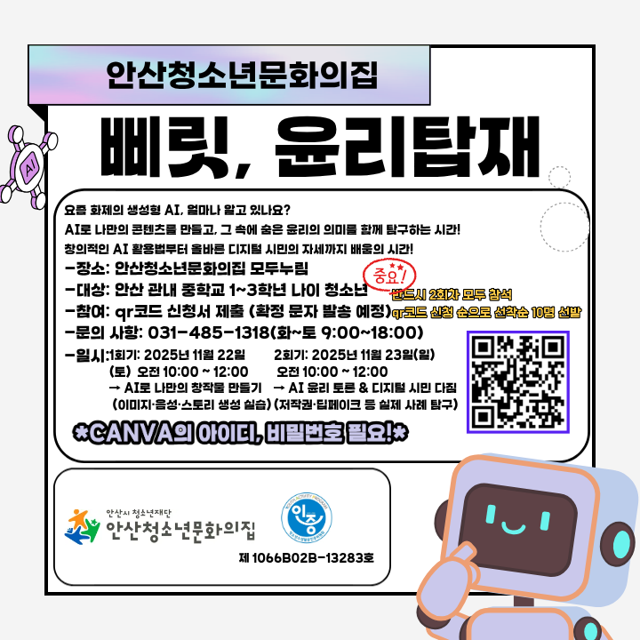 2025년 청소년활동인증제 "삐릿,윤리탑재" 참가자 모집안산청소년문화의집에서는 중1~3학년 나이의 청소년에게 11월 22일과 23일 주말을 활용해 ai로 나만의 컨텐츠를 만들고 그 속에 숨은 윤리의 의미를 함께 탐구하는 시간을 갖고자 합니다.관심이 있으시다면 qr코드를 통해 신청해주시길 바랍니다!신청주소:https://forms.gle/YMQUVzyvyu1DWfTg8