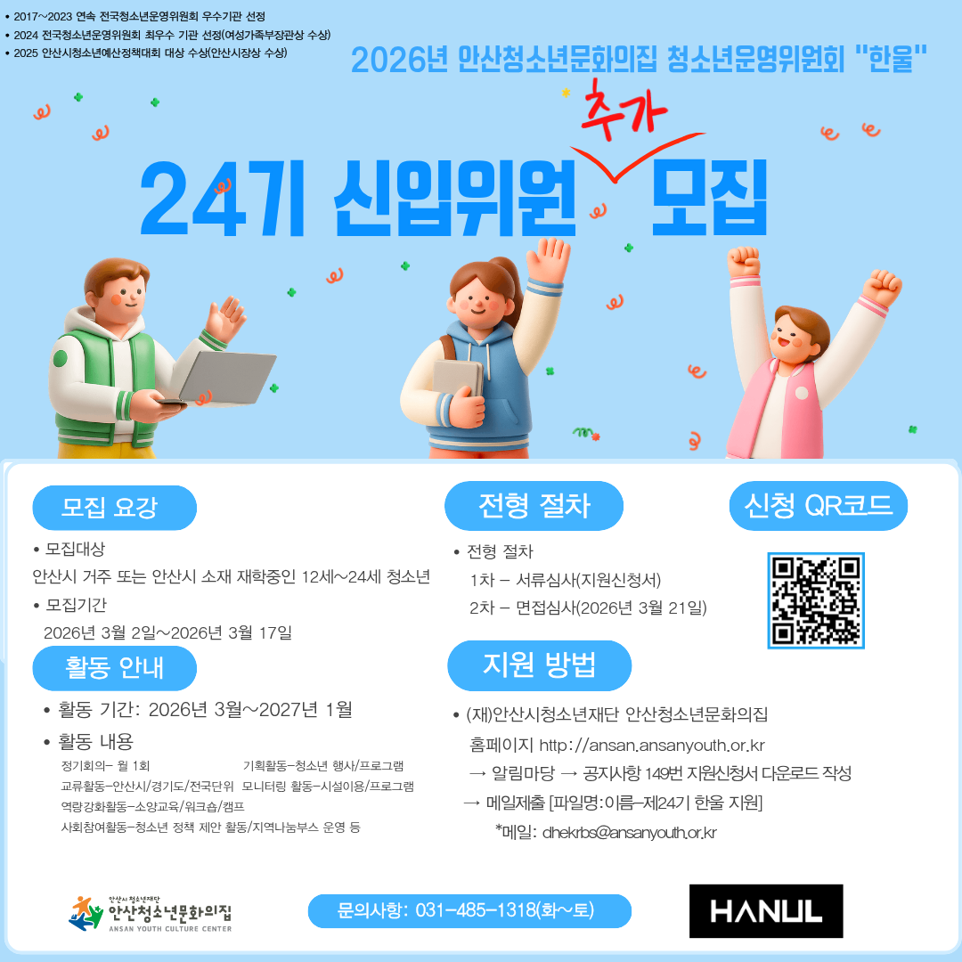 ♥전국 청소년운영위원회 '최우수' 기관으로 선정된 안산청소년문화의집은 청소년활동진흥법 제4조에 의거하여 청소년들이 시설의 정책 및 사업 과정에 주체적으로 참여하여 청소년 권익증진을 도모하도록 매해 청소년자치기구인 청소년운영위원회 '한울'을 구성하여 운영하고 있습니다. * 청소년운영위원회란? 청소년활동진흥법 제4조에 의거하여 청소년의 권리 보장 및 자율적인 정책참여 기회를 제공하기 위하여 청소년수련시설 단위에 청소년들로 구성된 자율적인 참여기구입니다. ♥2026년에 적극적으로 활동할 제24기 '한울' 위원을 모집하오니 안산 관내 청소년 여러분의 많은 지원 바랍니다 :) ◎추가 서류접수 : 2026년 3월 17일(화)까지 ◎1차 합격자 발표 : 2026년 3월 18일(수) *지원자 개별 연락 예정 ◎2차 면접 심사 : 2026년 3월 21일(토) ◎최종 합격자 발표 : 2026년 3월 24일(화) |